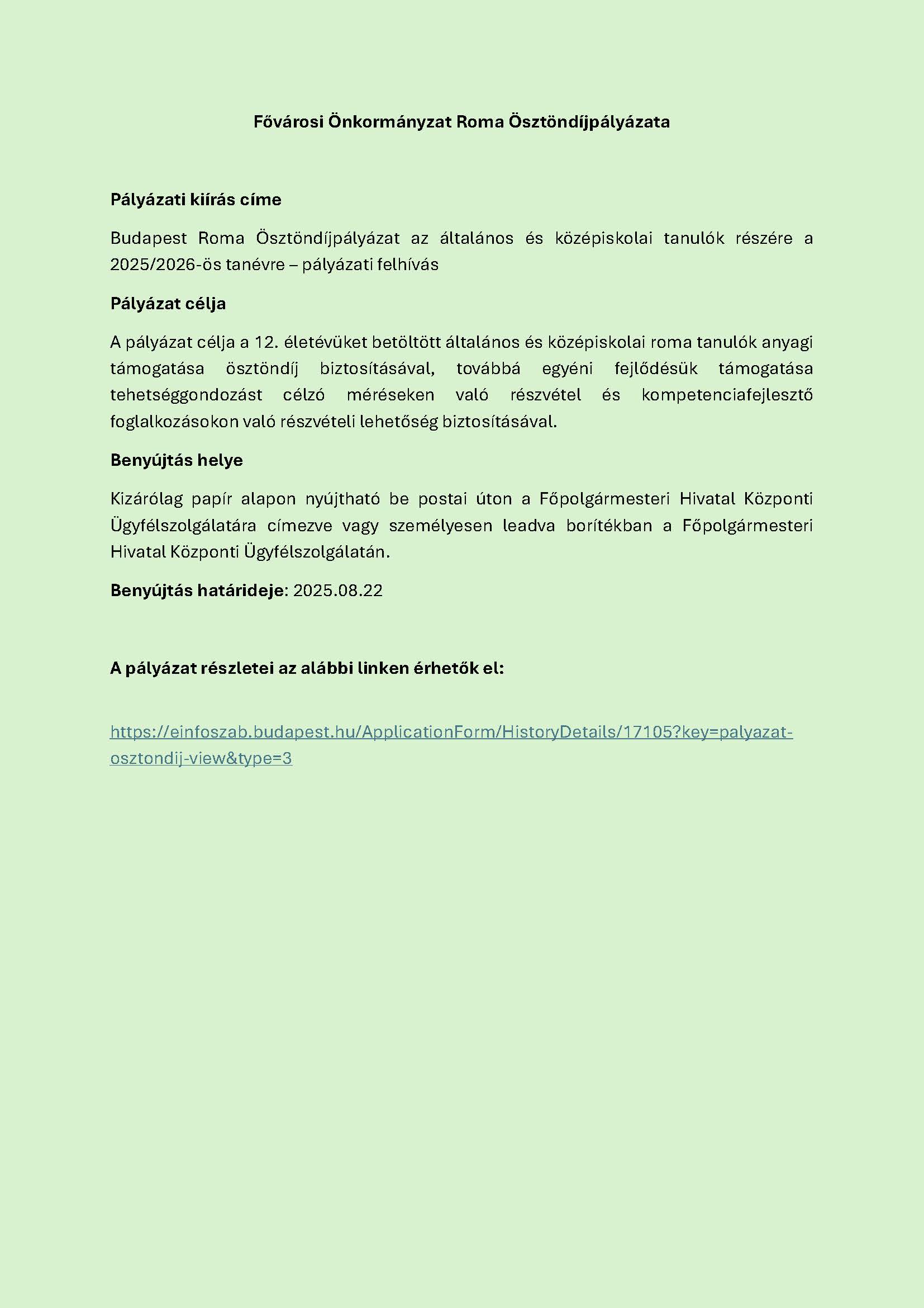 Budapest Roma Ösztöndíjpályázat az általános és középiskolai tanulók részére a 2025/2026-ös tanévre