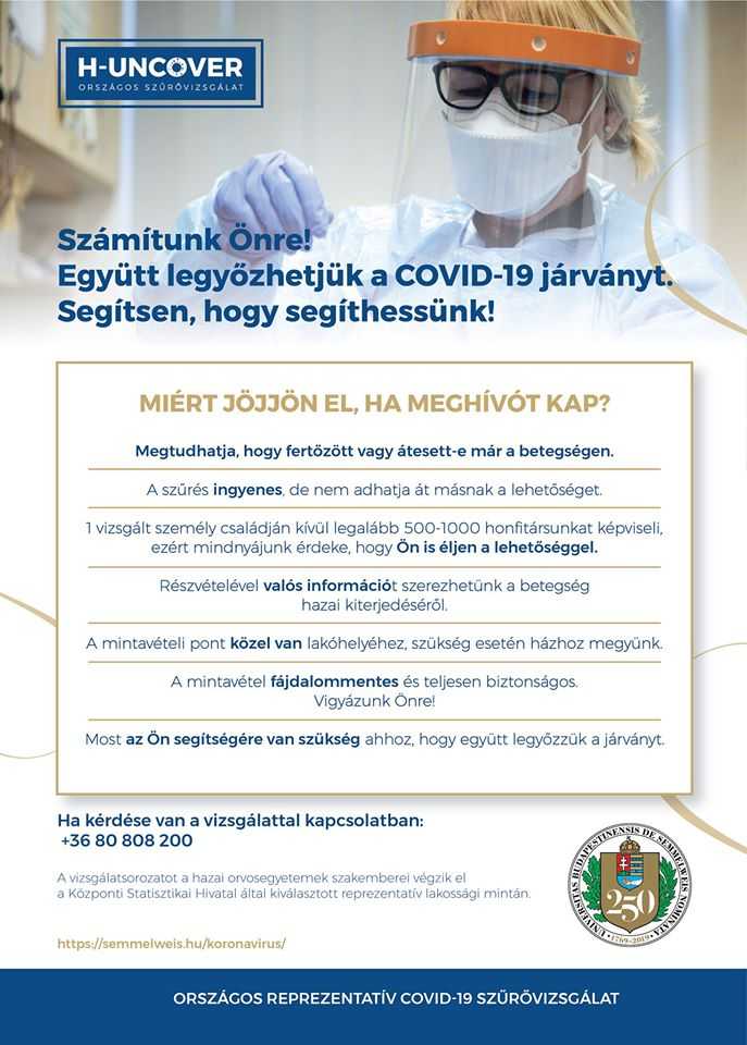 Hazánk négy orvosképző egyeteme országos reprezentatív szűrővizsgálatot indított a 14 év feletti korosztály körében, melyhez Kőbányán 66 személyt választottak ki. A vizsgálat célja, hogy pontosan feltérképezzék Magyarország átfertőzöttségét az újtípusú koronavírussal.