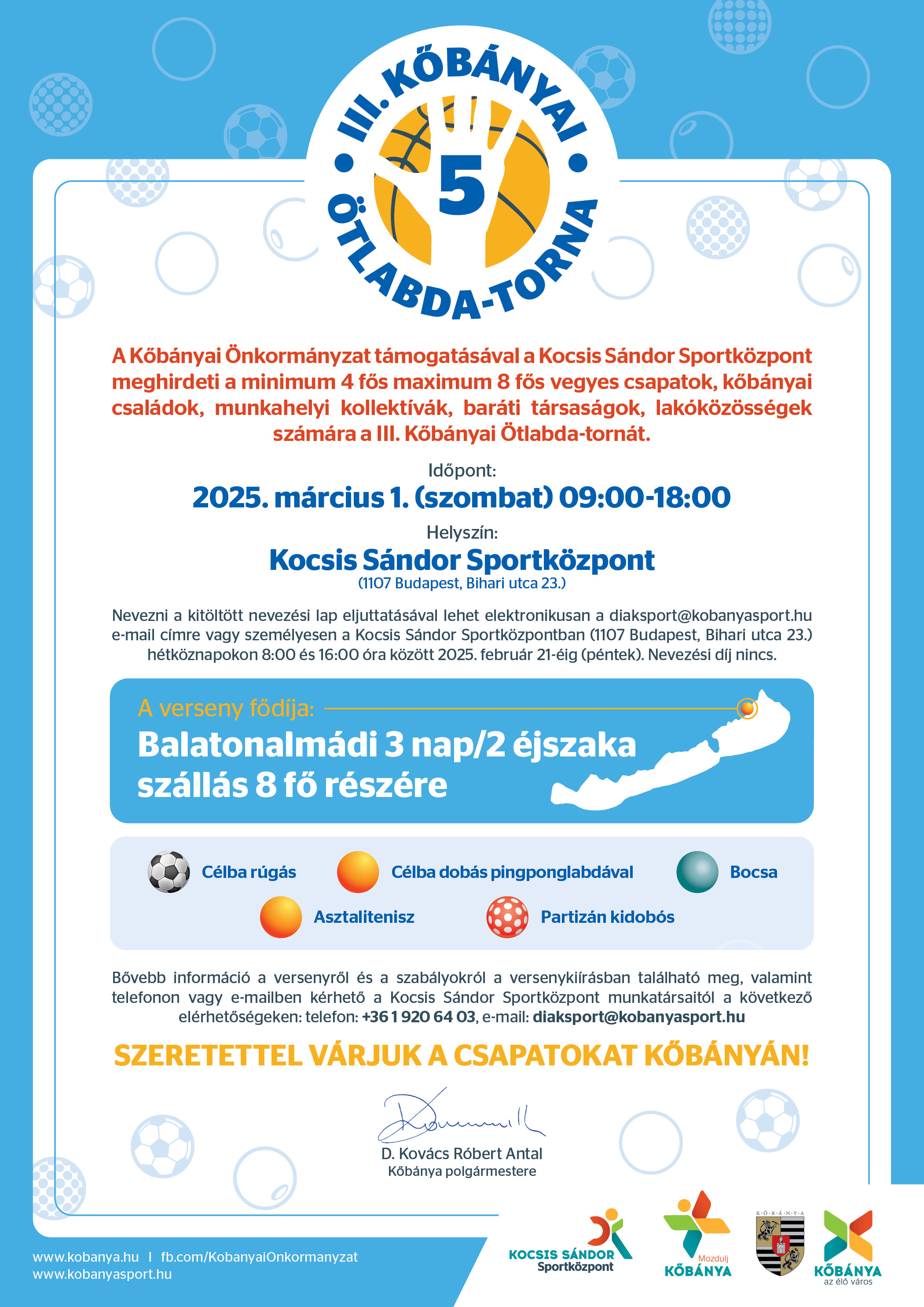 Nevezni a kitöltött nevezési lap eljuttatásával lehet elektronikusan a diaksport@kobanyasport.hu e-mail címre vagy személyesen a Kocsis Sándor Sportközpontban (1107 Budapest, Bihari utca 23.) hétköznapokon 8:00 és 16:00 óra között 2025. február 21-éig (péntek). Nevezési díj nincs.