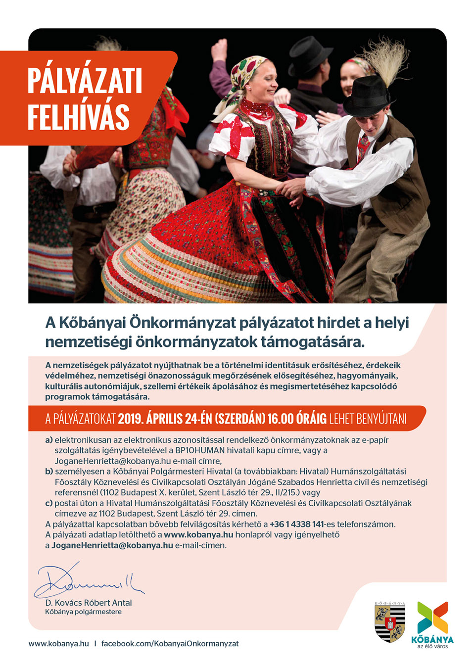 A Kőbányai Önkormányzat pályázatot hirdet a helyi nemzetiségi önkormányzatok támogatására. A nemzetiségek pályázatot nyújthatnak be a történelmi identitásuk erősítéséhez, érdekeik védelméhez, nemzetiségi önazonosságuk megőrzésének elősegítéséhez, hagyományaik, kulturális autonómiájuk, szellemei értékeik ápolásához és megismertetéséhez kapcsolódó programok támogatására.