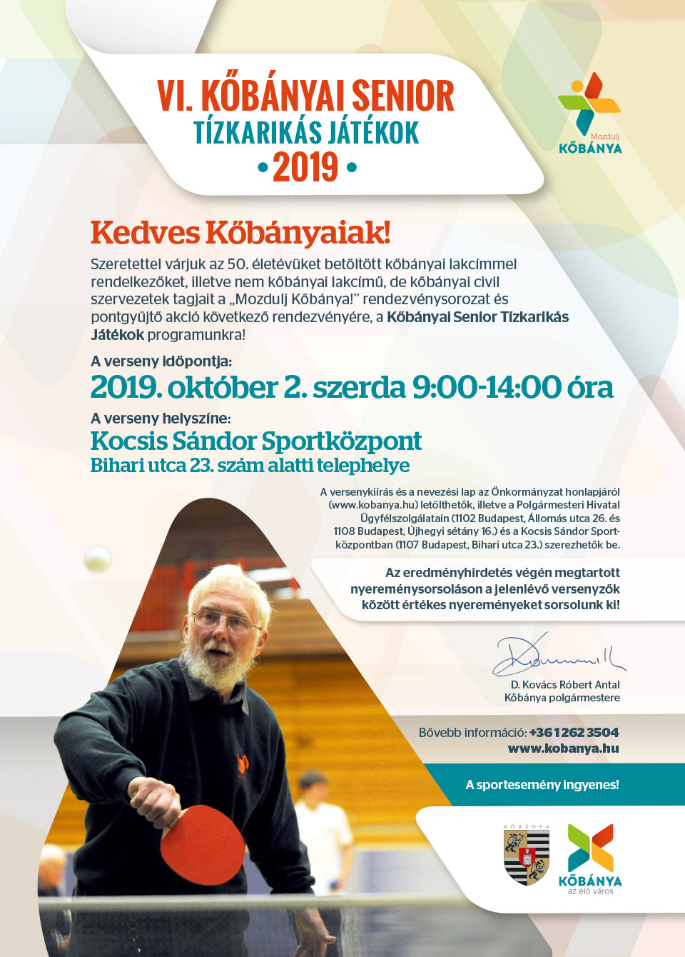 Szeretettel várjuk az 50. életévüket betöltött kőbányai lakcímmel rendelkezőket, illetve nem kőbányai lakcímű, de kőbányai civil szervezetek tagjait a „Mozdulj Kőbánya!” rendezvénysorozat és pontgyűjtő akció következő rendezvényére, a Kőbányai Senior Tízkarikás Játékok programunkra!