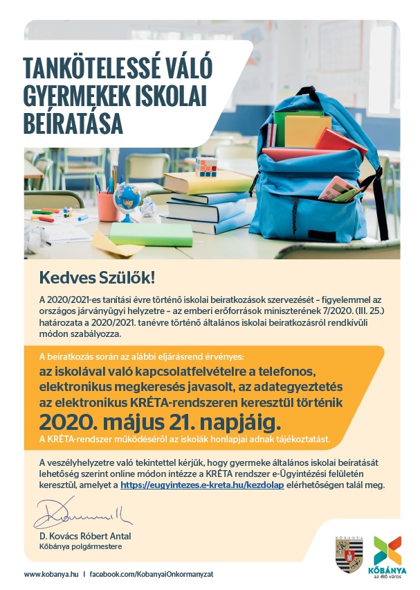 A veszélyhelyzetre való tekintettel kérjük, hogy gyermeke általános iskolai beíratását lehetőség szerint online módon intézze a KRÉTA rendszer e-Ügyintézési felületén keresztül, amelyet a https://eugyintezes.e-kreta.hu/kezdolap elérhetőségen talál meg.