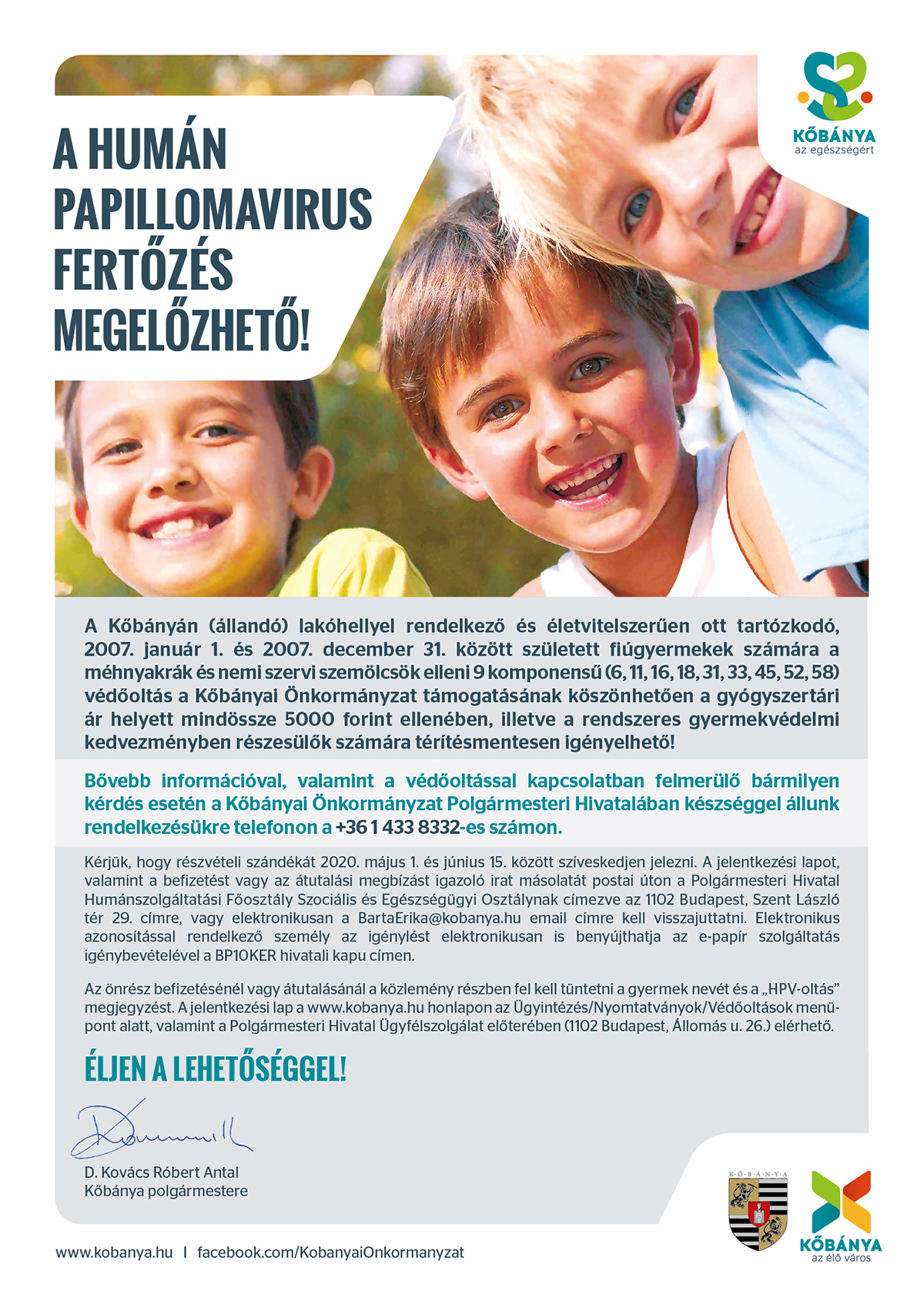 A Kőbányán (állandó) lakóhellyel rendelkező és életvitelszerűen ott tartózkodó, 2007. január 1. és 2007. december 31. között született fiúgyermekek számára a méhnyakrák és nemi szervi szemölcsök elleni 9 komponensű (6, 11, 16, 18, 31, 33, 45, 52, 58) védőoltás a Kőbányai Önkormányzat támogatásának köszönhetően a gyógyszertári ár helyett mindössze 5000 forint ellenében, illetve a rendszeres gyermekvédelmi kedvezményben részesülők számára térítésmentesen igényelhető!