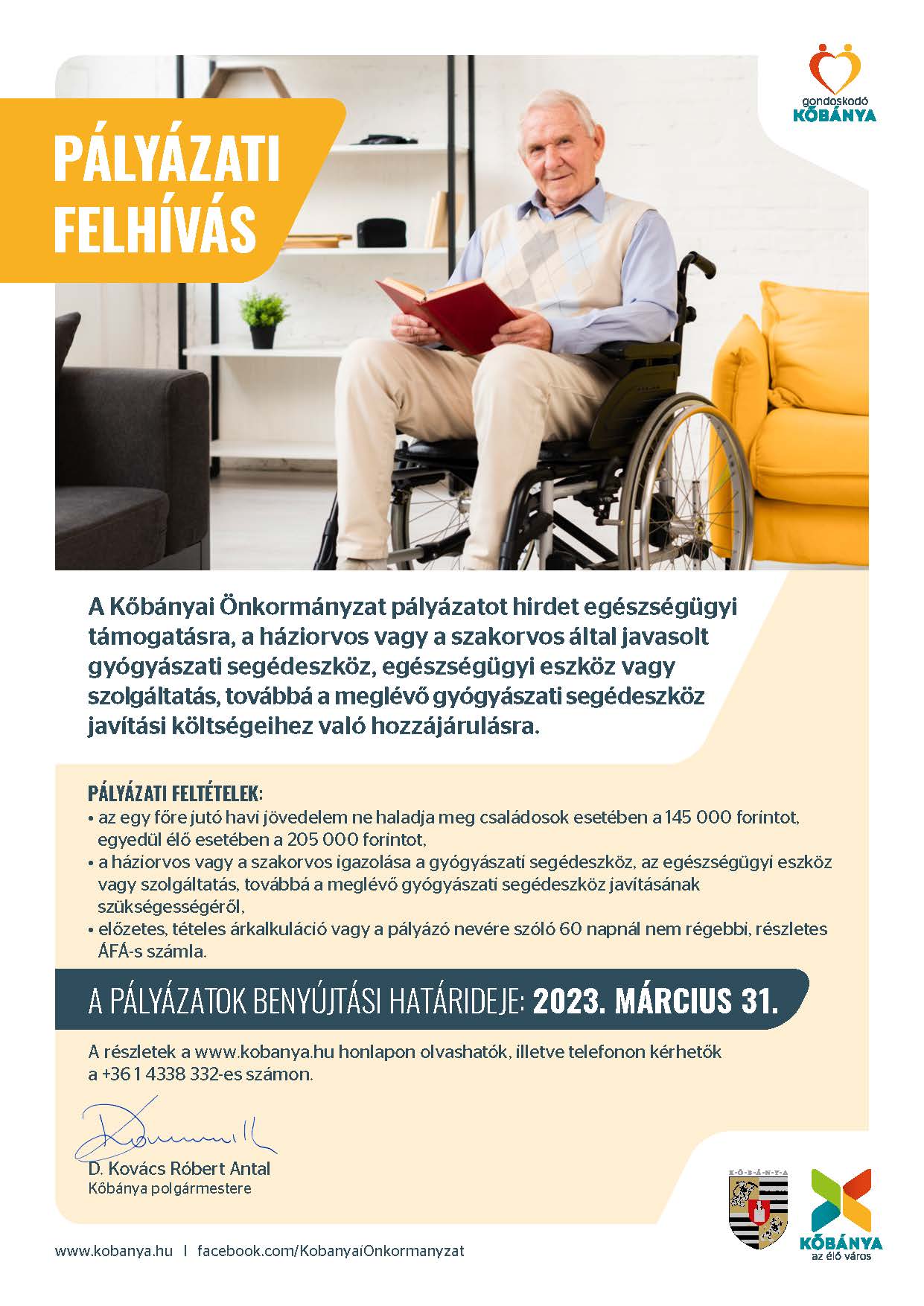 A Kőbányai Önkormányzat pályázatot hirdet egészségügyi támogatásra, a háziorvos vagy a szakorvos által javasolt gyógyászati segédeszköz, egészségügyi eszköz vagy szolgáltatás, továbbá a meglévő gyógyászati segédeszköz javítási költségeihez való hozzájárulásra.