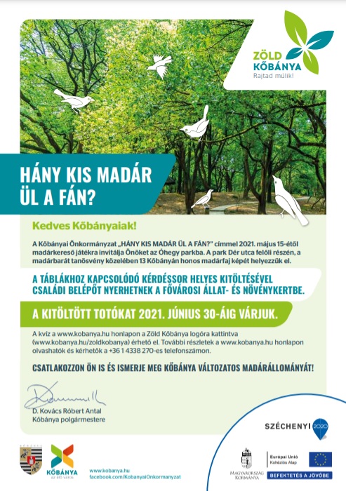 A Kőbányai Önkormányzat „HÁNY KIS MADÁR ÜL A FÁN?” címmel 2021. május 15-étől madárkereső játékra invitálja Önöket az Óhegy parkba.