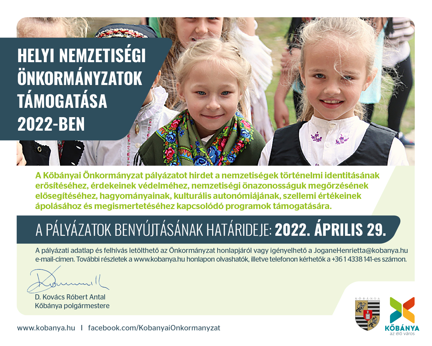 A Kőbányai Önkormányzat pályázatot hirdet a helyi nemzetiségi önkormányzatok 2022. évi szakmai programjainak és a programokhoz kapcsolódó tárgyi eszközök beszerzésének támogatására.