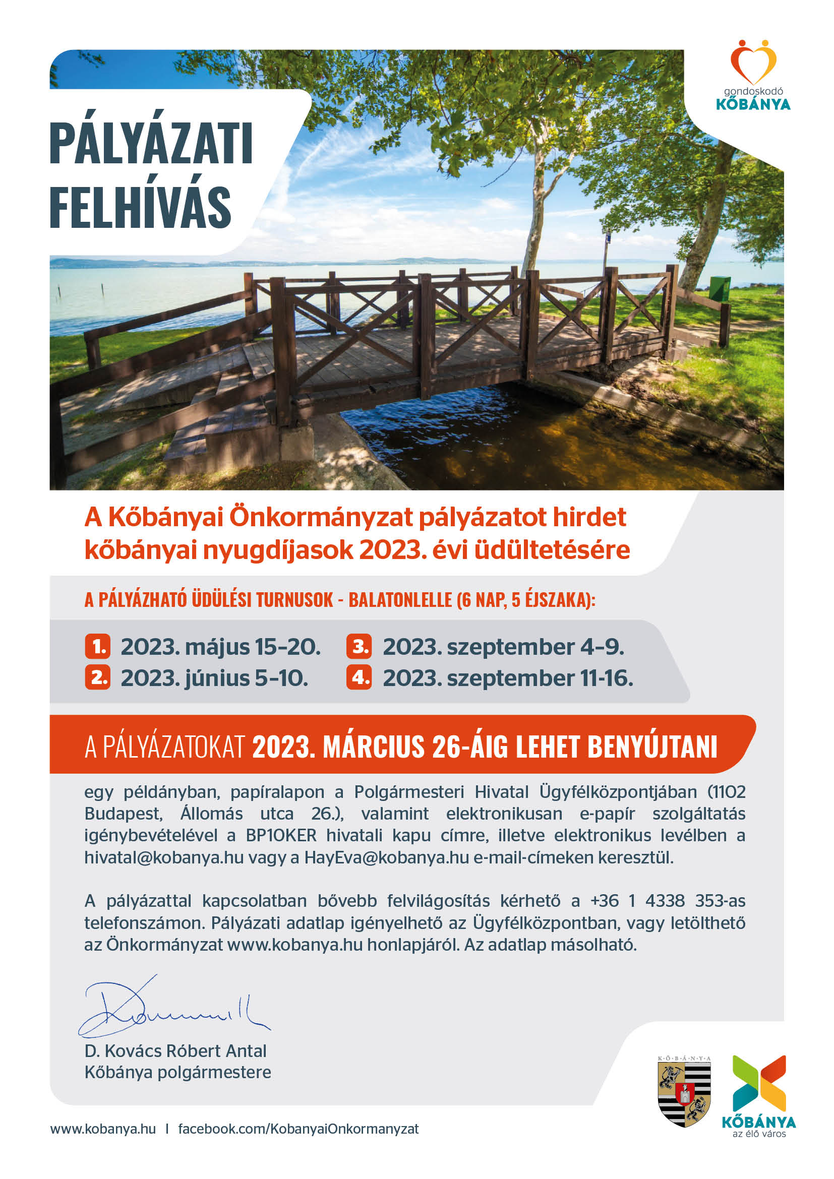 A pályázatokat 2023. március 26-áig lehet benyújtani egy példányban, papíralapon a Budapest Főváros X. kerület Kőbányai Polgármesteri Hivatal Ügyfélközpontjában ( 1102 Budapest, Állomás u. 26.), elektronikusan e-papír szolgáltatás igénybevételével a BP10KER hivatali kapu címre, illetve elektronikus levélben a hivatal@kobanya.hu vagy a HayEva@kobanya.hu e-mail címeken keresztül.