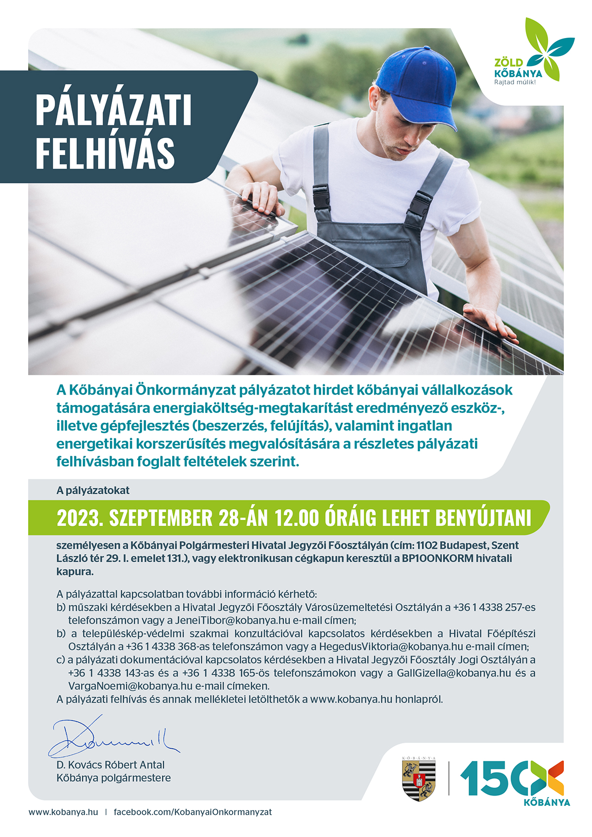 A Budapest Főváros X. kerület Kőbányai Önkormányzat pályázatot hirdet kőbányai vállalkozások támogatására energiaköltség-megtakarítást eredményező eszköz-, illetve gépfejlesztés, valamint ingatlan energetikai korszerűsítés megvalósításához a részletes pályázati felhívásban foglalt feltételek szerint.