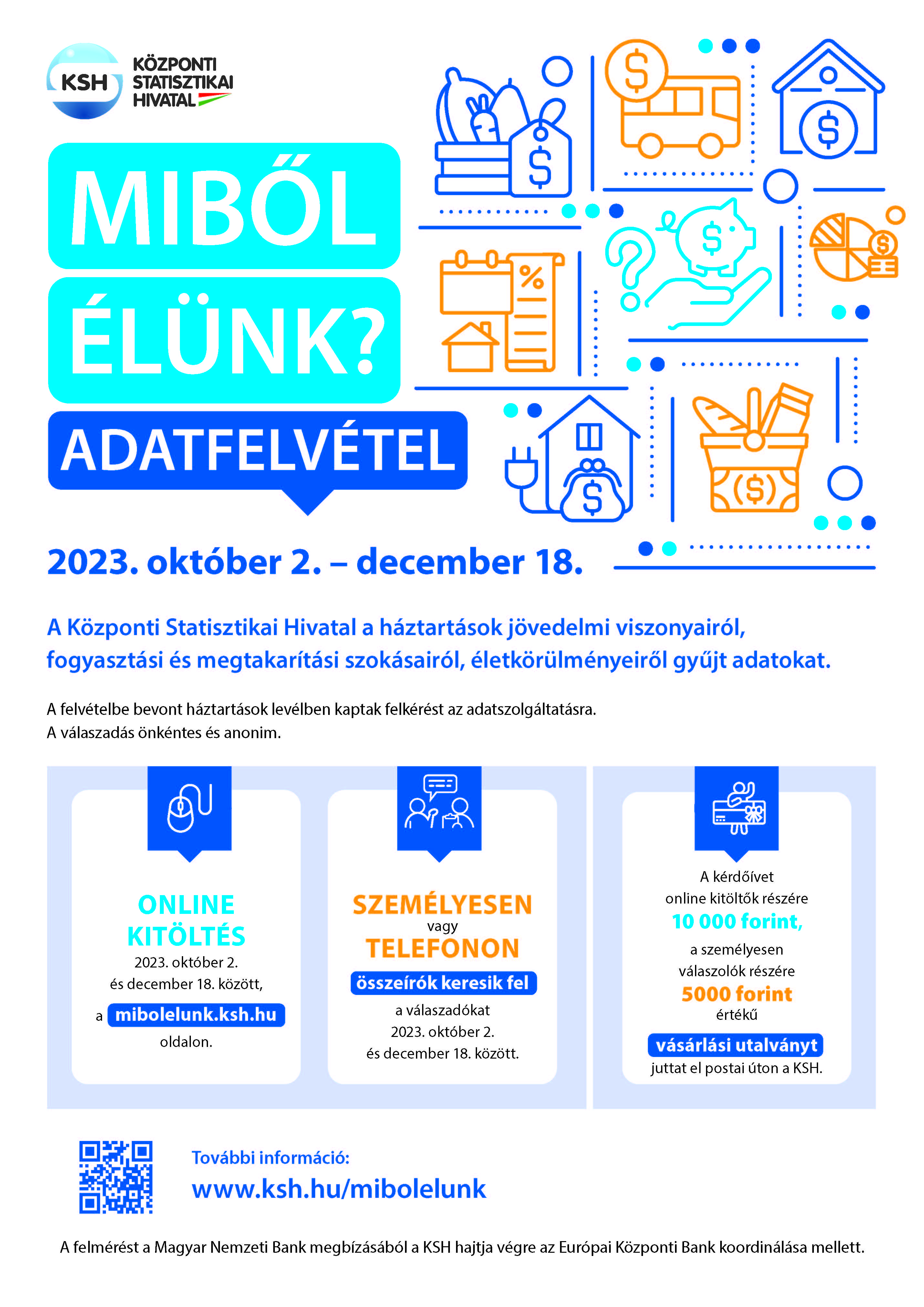 A Központi Statisztikai Hivatal Budapest 10. kerület településen 2023. október 2. és december 18. között hajtja végre a háztartások életkörülményeinek feltárására irányuló „Miből élünk?” című adatfelvétel negyedik hullámát.