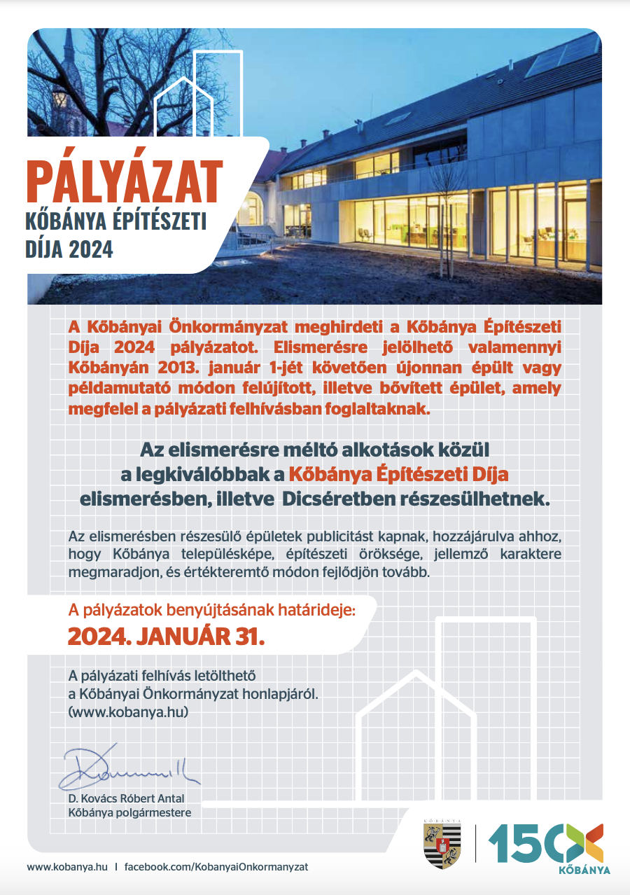 A Kőbányai Önkormányzat meghirdeti a Kőbánya Építészeti Díja 2024 pályázatot.