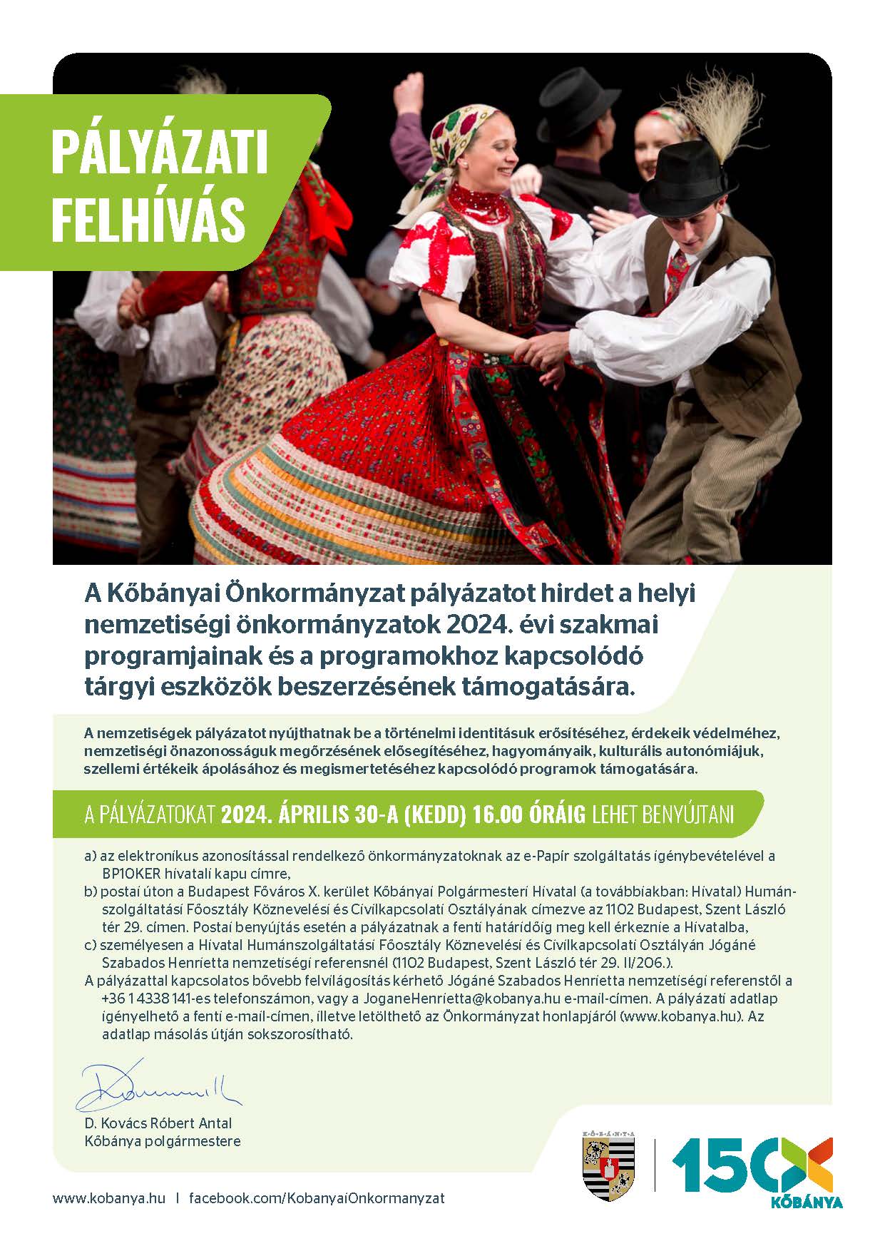 A Kőbányai Önkormányzat pályázatot ír ki a helyi nemzetiségi önkormányzatok 2024. évi szakmai programjainak és a programokhoz kapcsolódó tárgyi eszközök beszerzésének támogatására.