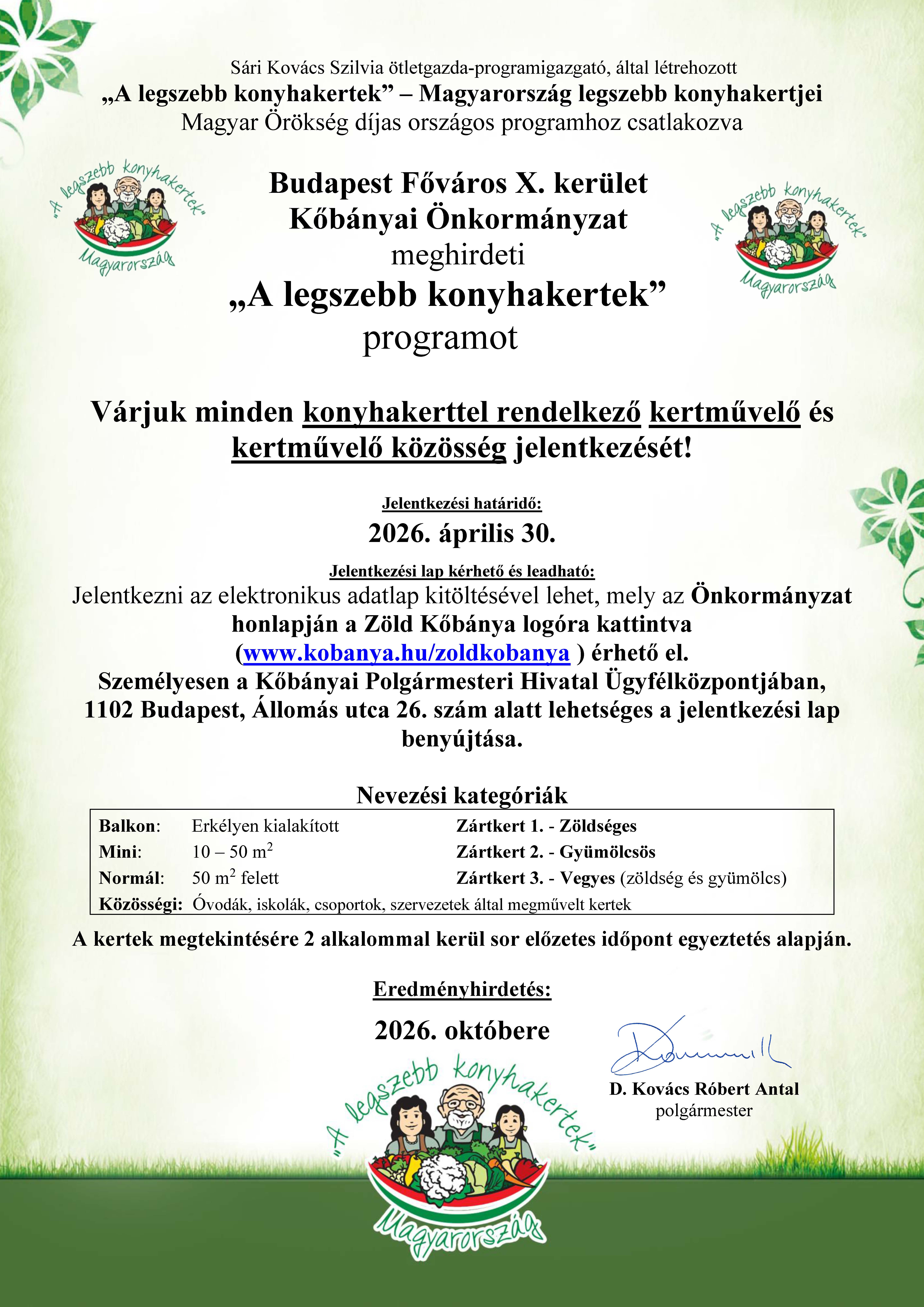 Budapest Főváros X. kerület Kőbányai Önkormányzat meghirdeti „A legszebb konyhakertek” programot.