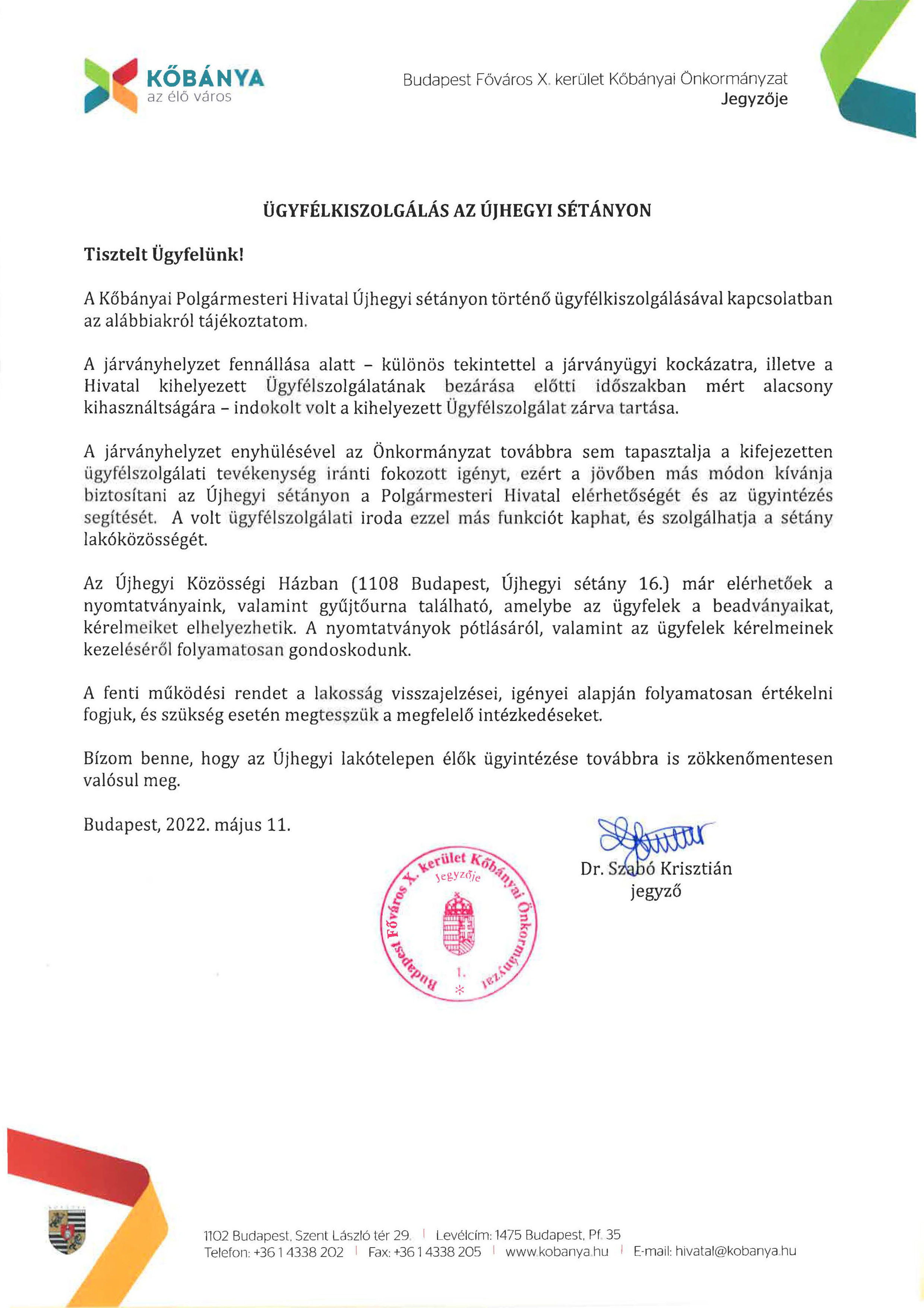A Kőbányai Polgármesteri Hivatal Úihegyi sétányon történő ügyfélkiszolgálásával kapcsolatban az alábbiakról tájékoztatjuk.