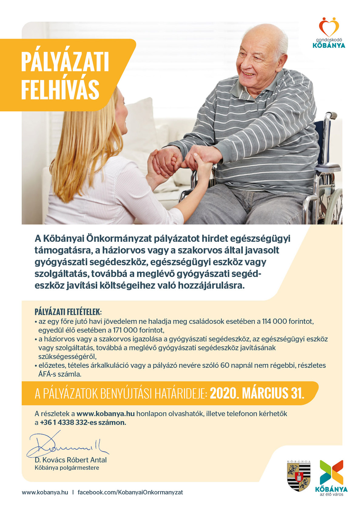 A Kőbányai Önkormányzat pályázatot hirdet egészségügyi támogatásra, a háziorvos vagy a szakorvos által javasolt gyógyászati segédeszköz, egészségügyi eszköz vagy szolgáltatás, továbbá a meglévő gyógyászati segédeszköz javítási költségeihez való hozzájárulásra.