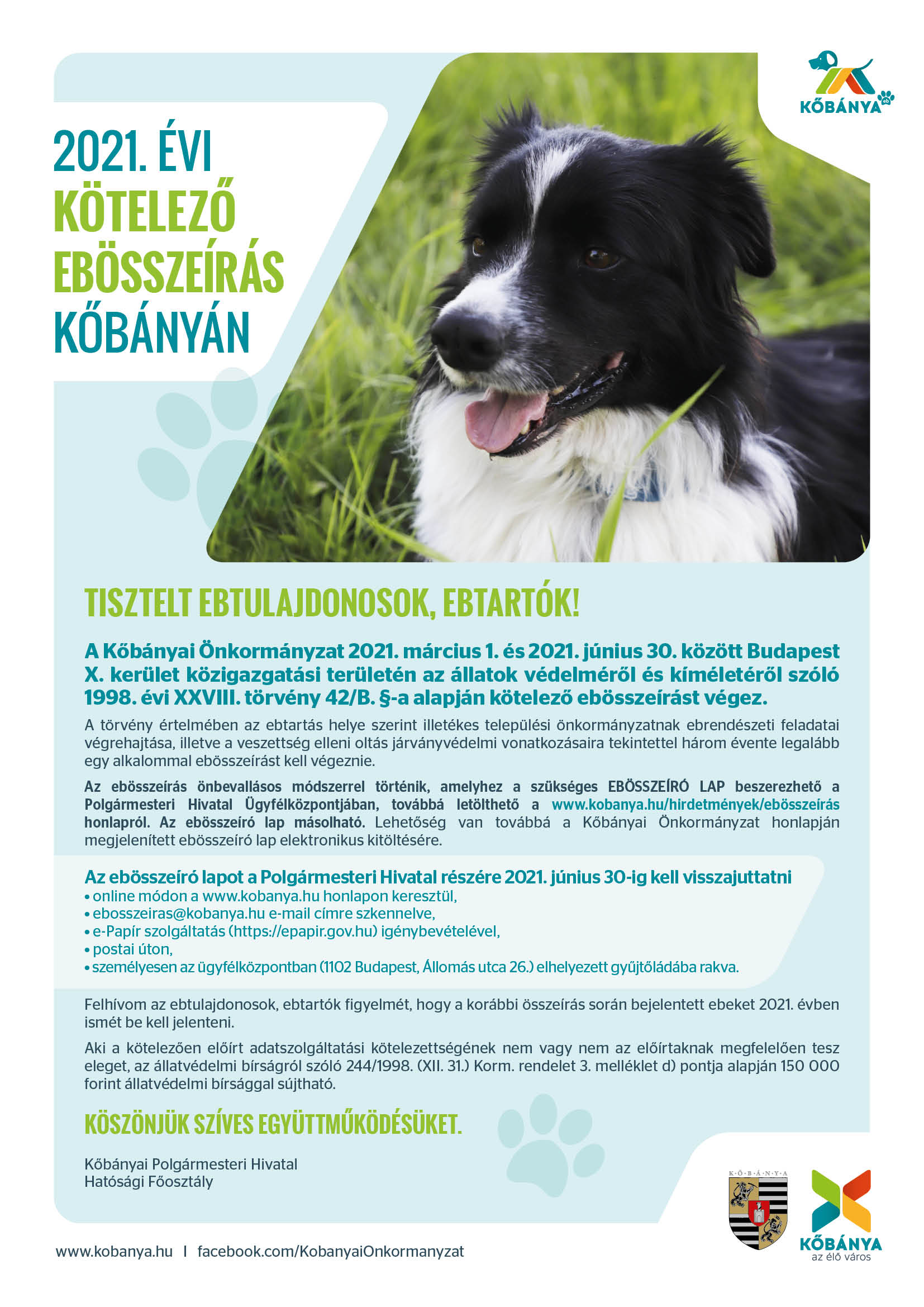 Budapest X. kerület területén az állatok védelméről és kíméletéről szóló 1998. évi XXVIII. törvény 42/B. §-a alapján kerül sor az ebek kötelező összeírására a törvény 42/A. § (4) bekezdésében meghatározott tartalommal. A települési önkormányzat az összeírás alapján az ebtartók által szolgáltatott adatokról helyi elektronikus nyilvántartást köteles vezetni az állat tulajdonosa, tartója és más személyek jogainak, személyes biztonságának és tulajdonának védelme, valamint ebrendészeti és állatvédelmi feladatainak hatékony ellátása céljából.