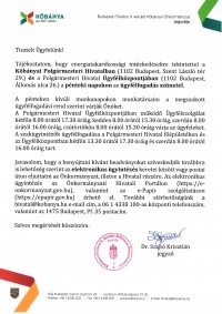 Tájékoztatom, hogy energiatakarékossági intézkedésekre tekintettel a Kőbányai Polgármesteri Hivatalban (1102 Budapest, Szent László tér 29.) és a Polgármesteri Hivatal Ügyfélközpontjában (1102 Budapest, Állomás utca 26.) a pénteki napokon az ügyfélfogadás szünetel.