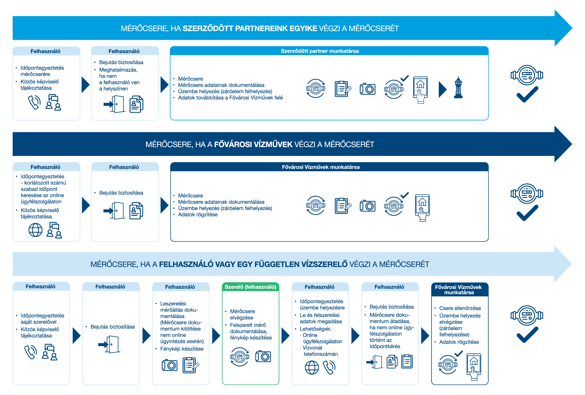 A mérőcsere legegyszerűbben a Fővárosi Vízművek munkatársainak és szerződött partnereinek közreműködésével intézhető el, akik a szereléshez és üzembe helyezéshez szükséges minden teendőt elvégeznek. A Fővárosi Vízművek javasolja fogyasztóinak, hogy a lehető leghamarabb gondoskodjanak a hiteles mérő beszereléséről. A megrendelést érdemes az év második hónapjára időzíteni: február 1. és 28. között a Fővárosi Vízművek és számos szerződött partnere akciót hirdet a mellékmérők cseréjére.