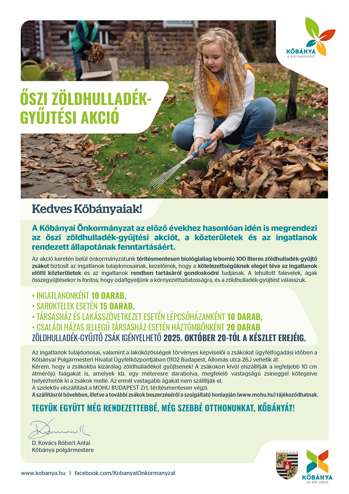 Az akció keretén belül önkormányzatunk térítésmentesen biológiailag lebomló 100 literes zöldhulladék-gyűjtő zsákot biztosít az ingatlanok tulajdonosainak, kezelőinek, hogy a kötelezettségüknek eleget téve az ingatlanok előtti közterületek és az ingatlanok rendben tartásáról gondoskodni tudjanak. A lehullott falevelek, ágak összegyűjtésekor is fontos, hogy odafigyeljünk a környezettudatosságra, és a zöldhulladék-gyűjtést válasszuk.