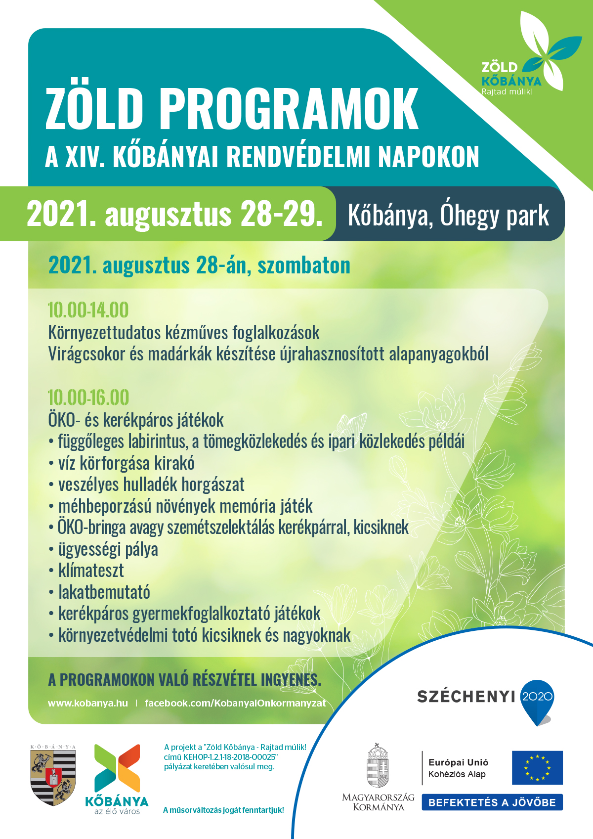 2021. október 3-án vasárnap kerül megrendezésre a "Zöld Kőbánya - Rajtad múlik" című pályázat projektzáró eseménye, melynek fő eleme a Kőbányai Klímastratégia bemutatás. A tematikus nap keretében ismeretterjesztő előadások, interaktív workshopok, bemutatók és kreatív foglalkozások várják az érdeklődőket. A program összeállításakor elsődleges cél volt, hogy minden korosztály számára nyújtsunk elfoglaltságot a nap folyamán, a legkisebbektől az idős korosztályig.