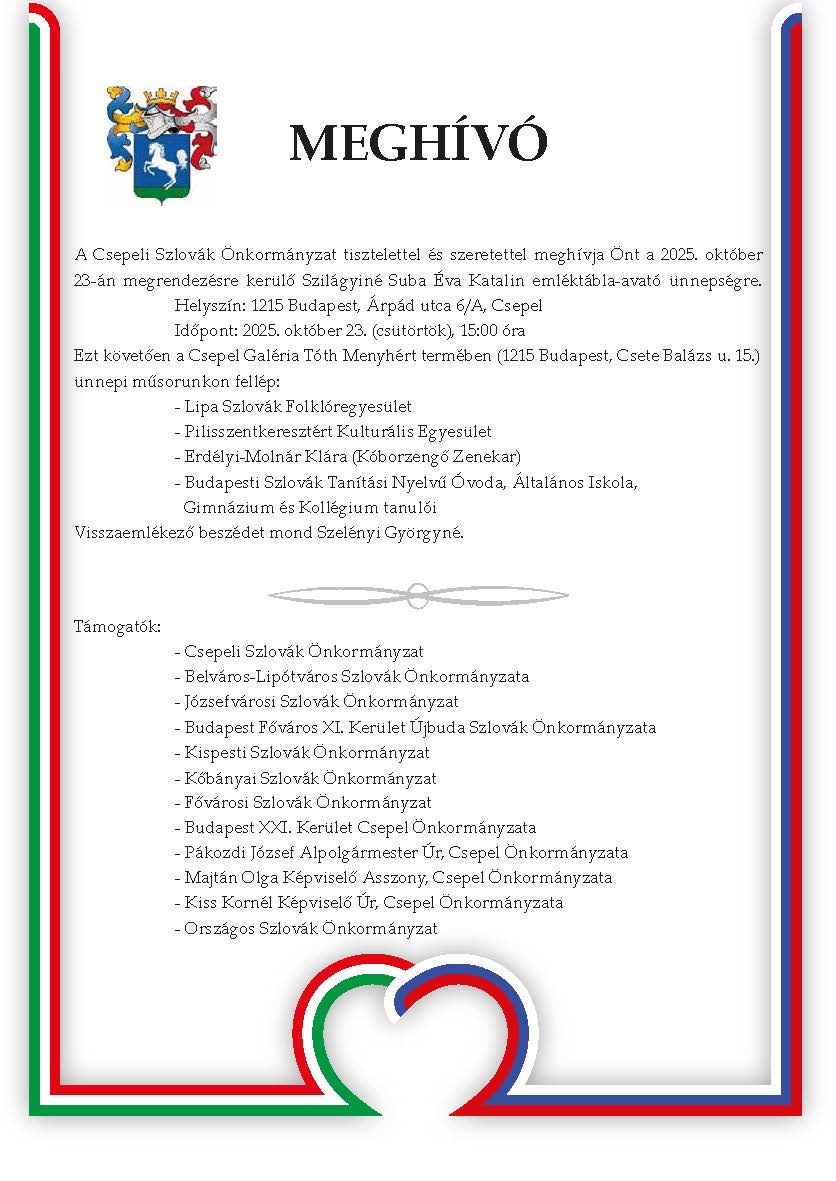 A Csepeli Szlovák Önkormányzat meghívója a 2025. október 23-án megrendezésre kerülő Szilágyiné Suba Éva Katalin emléktábla-avató ünnepségre.