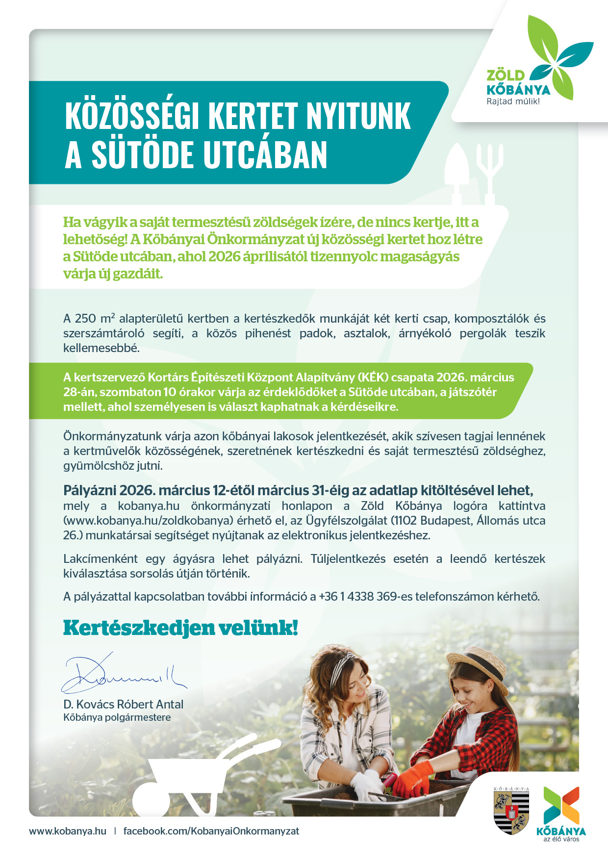 Önkormányzatunk várja azon kőbányai lakosok jelentkezését, akik szívesen tagjai lennének a kertművelők közösségének, szeretnének kertészkedni és saját termesztésű zöldséghez, gyümölcshöz jutni.